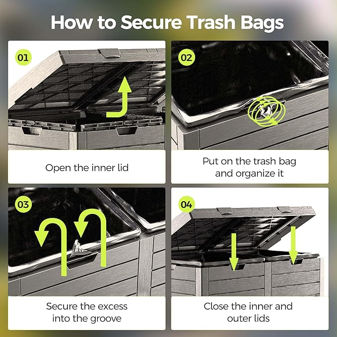 - Durable Resin Material: Made from waterproof resin, this trash can is built to withstand the elements. It effectively resists rain, UV radiation, and corrosion, ensuring long-lasting durability and reliable performance in any weather