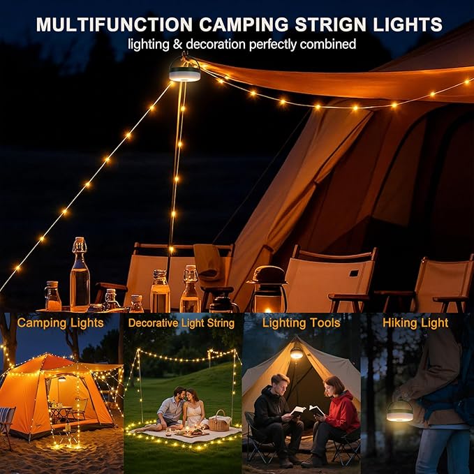 - ๐9 Lighting Modes & Timer: Camp lights string provides 3 levels of brightness, and 6 light modes (Warm White String Light, Alternating Flash, Breathing Flash, Camping Lantern, SOS flash, Camping Lantern + String Light)โmeeting different lighting needs. It also equipped with 2H/4H/6H timer function, no need to turn off manually after setting. Just long-press the power button to turn it off.