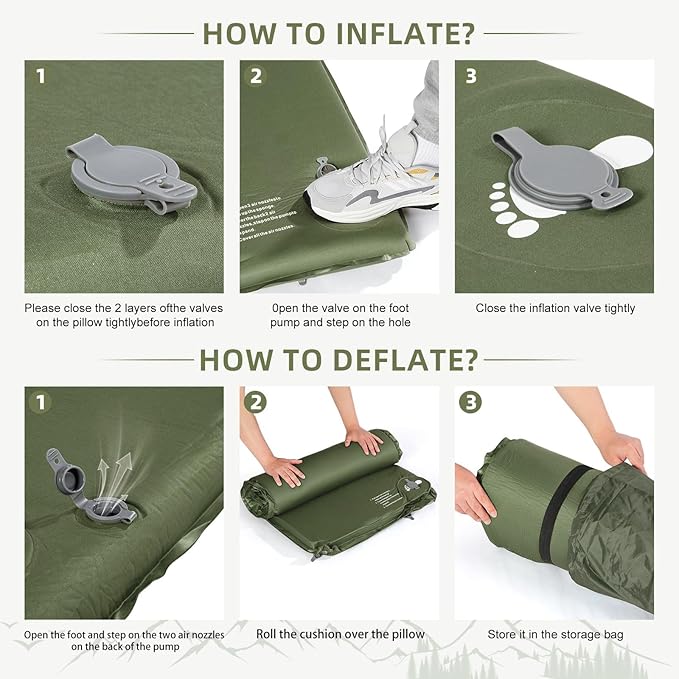 - Upgraded Valves For Easier Storage: Storage of foam sleeping mats has always been a challenge, and to make it easier, we have revolutionized the valve making it a dual-use valve. When inflating, simply open the two layers for self-inflating. When you need to deflate, OPEN ONLY THE FIRST LAYER and be sure to keep the second layer closed, in this state, air can only go out and not in, then you just need to squeeze out the air to complete the storage.