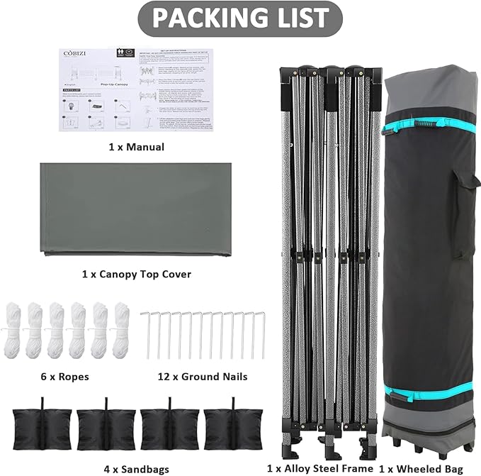 - 【200 SQ Feet Shade Area】COBIZI 10x20 pop up tent provides 200 SQFT spacious covered space, it can easily accommodate 15-20 people, meet your different needs for holding large gatherings. Perfect for wedding, birthday party, market event and other larger events. When in use, always secure the 10x20 pop up tent with the included stakes and ropes to avoid damage. One year after-sale protection for canopy frame; Six months after-sale protection for fabrics and accessories.