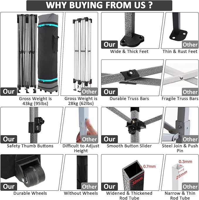 - 【3 Height Settings】10x20 pop up party tent straight leg has 3 height settings. Thumb latch lock system easy to lock and release, raise the pop up tent to a desired height. Canopy tent 10x20 straight leg height options: 220cm/86.6inch, 230cm/90.6inch, 240cm/94.5inch. Corresponding party tent center height options: 310cm/122.0inch, 320cm/126.0inch, 330cm/129.9inch. 10x20 canopy perfect for commercial activities, camping, festivals, tailgating, backyard events and etc..