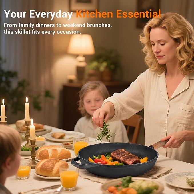 - Naturally Nonstick, Easy to Clean & Season Pre-seasoned for effortless food release, this cast iron pan is simple to maintain—just hand wash, dry over low heat, and lightly oil.(Dishwasher not recommended)