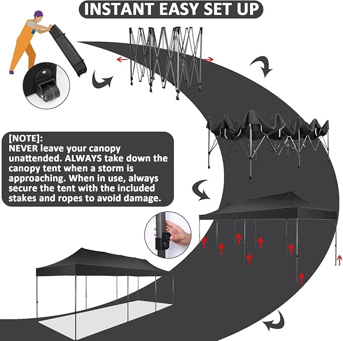 - 【300 SQ Feet Shade Area】COBIZI 10x30 pop up tent provides 300 SQFT spacious covered space, it can easily accommodate 15-20 people, meet your different needs for holding large gatherings. Perfect for wedding, birthday party, market event and other larger events. When in use, always secure the 10x30 pop up tent with the included stakes and ropes to avoid damage. One year after-sale protection for canopy frame; Six months after-sale protection for fabrics and accessories.