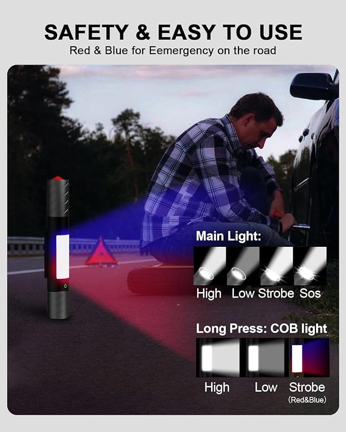 Rechargeable Flashlight, Includes Screwdriver, Window Breaker, 4 Main Lighting Modes, 3 Side Lighting Modes, High and Low Beam, Magnetic Rechargeable Flashlight for Home, Car, Hiking, Camping
