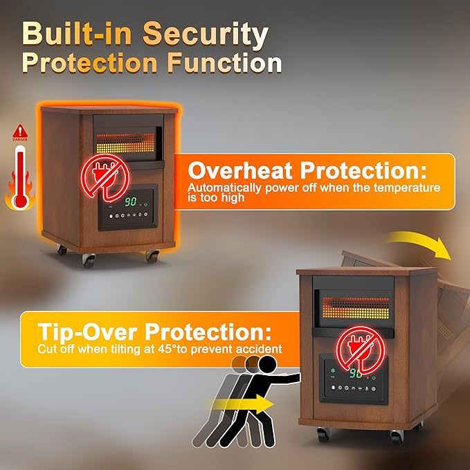 - Safe and Easy to Operate: Our room heaters come with an easy-to-use remote control, allowing you to adjust settings from anywhere in the room. A clear LCD display lets you precisely adjust the heating temperature range (50-90°F). Safety is a top priority, with a child- lock and cool-touch housing, ensuring warmth for both adults and children. Built-in anti-tip protection and an overheat switch automatically shut off in emergencies.