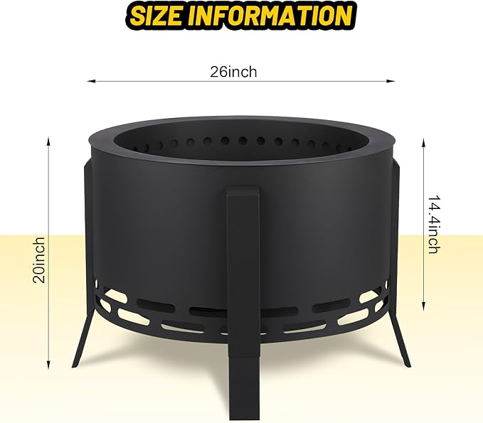 26" Smokeless Fire Pit with Ash Tray Base,Smokeless Outdoor Firepits with Adjustable Foot&Fire Poker,Firepit with Dust Bag,Outdoor Fire Pits for BBQ,Bonfire,Camping