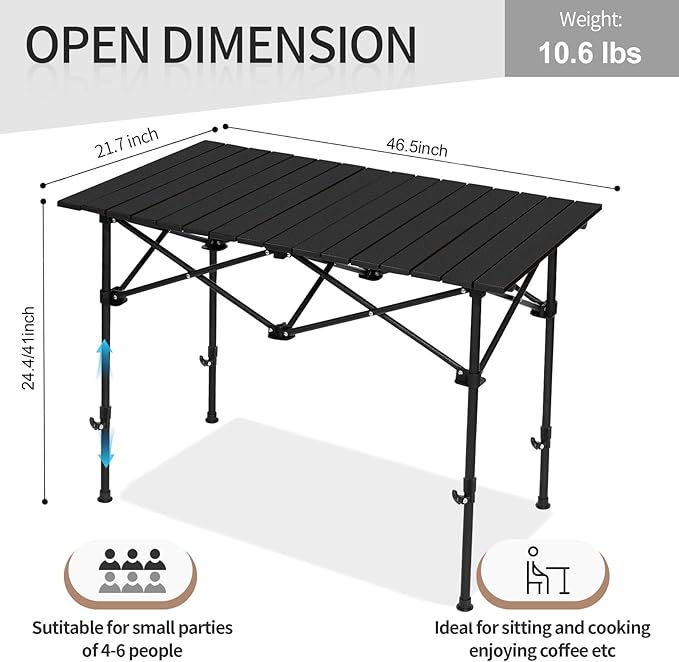 - ๐COMPACT SIZE: The folding camping table desktop area (46.5 ร 21.7 inches) can enough for the family of 4-6 people,This folding table can be adjusted from 24.4" to 41" in height to accommodate uneven surfaces.the weight of the foldable camping table is 10.6 pounds and it can support up to 110 lbs.