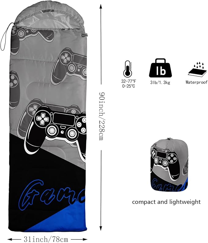 - Unique Gamer Design:This Gamer pattern sleeping bag is made of 3D digital printing with vibrant colors and patterns,size: 31W x 90L inches,temperature range: 32℉-77℉ (0℃-25℃),it also also have a weather resistant waterproof design to keep you warm and prevent you from any dampness,can be used in 3 seasons