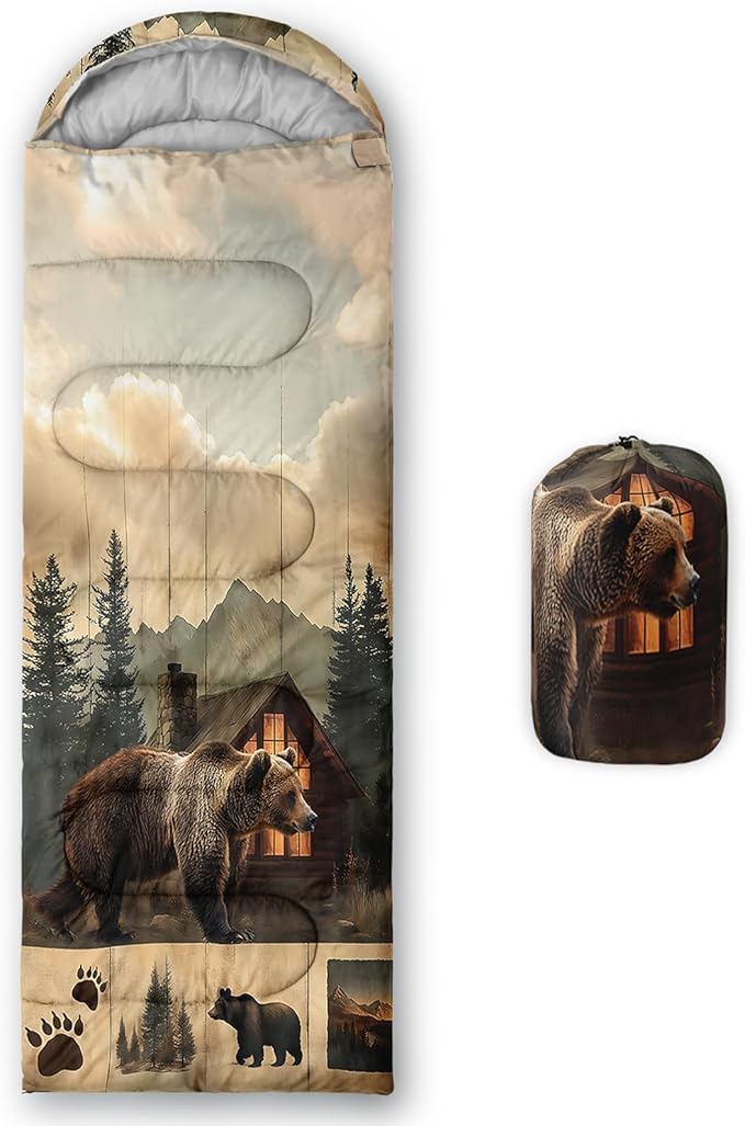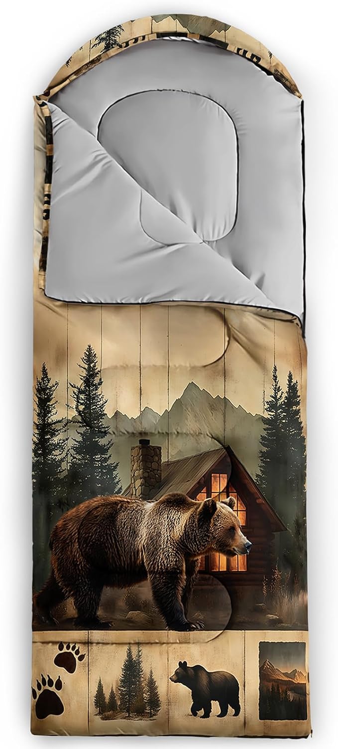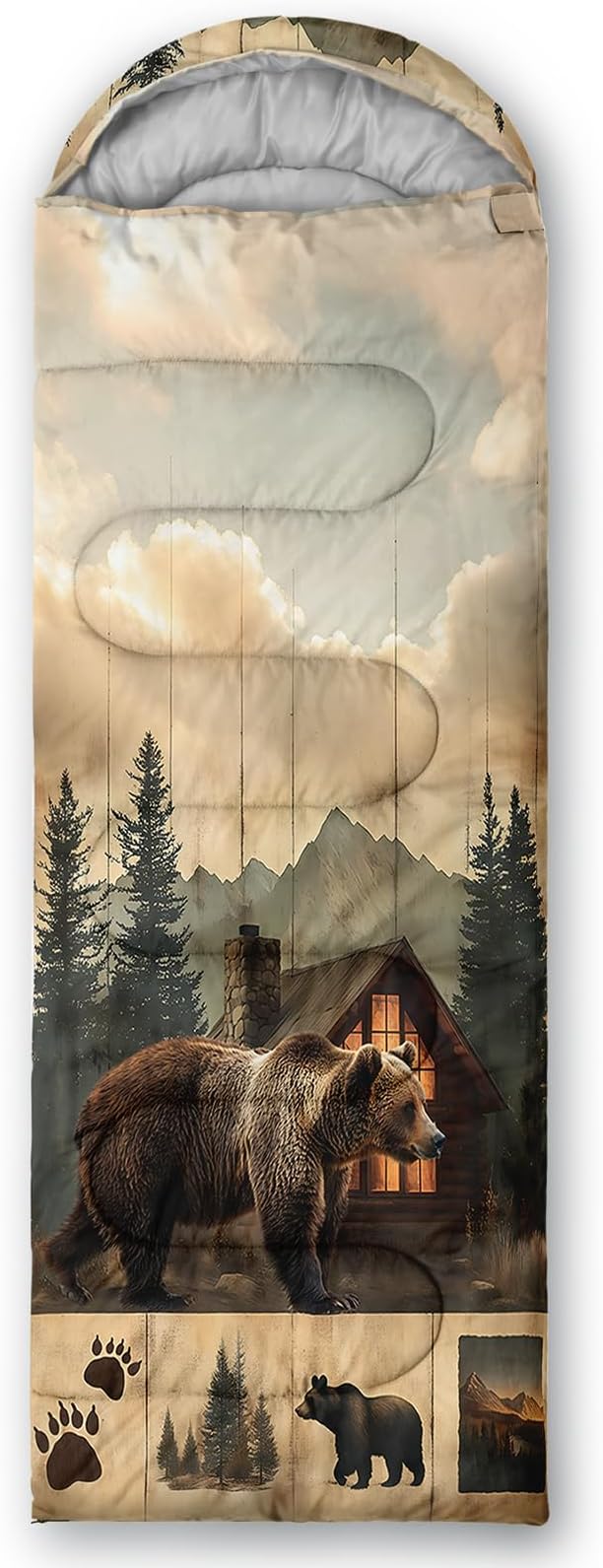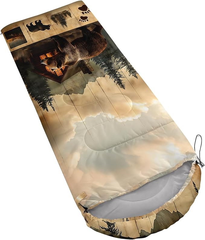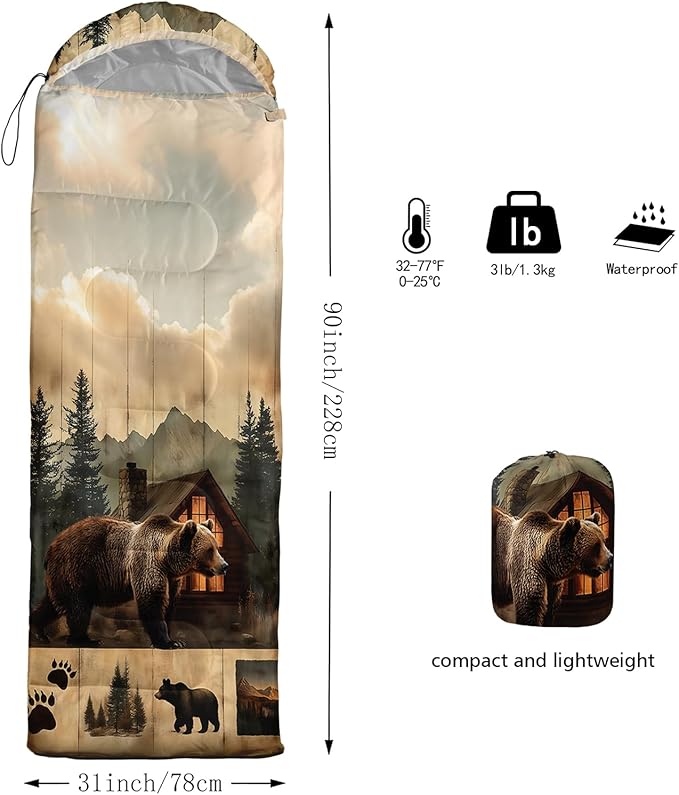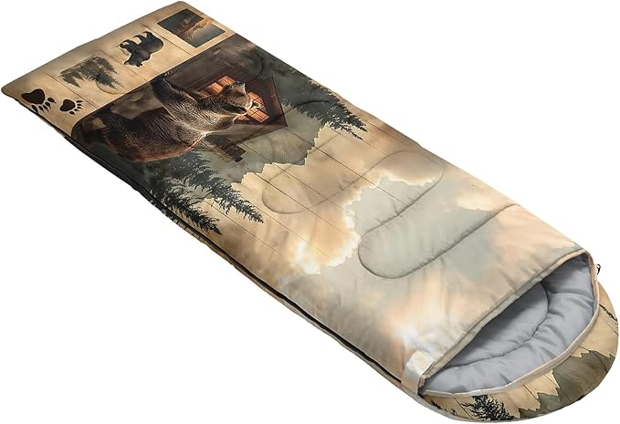 - Unique Bear Design:This Bear pattern sleeping bag is made of 3D digital printing with vibrant colors and patterns,size: 31W x 90L inches,temperature range: 32℉-77℉ (0℃-25℃),it also also have a weather resistant waterproof design to keep you warm and prevent you from any dampness,can be used in 3 seasons