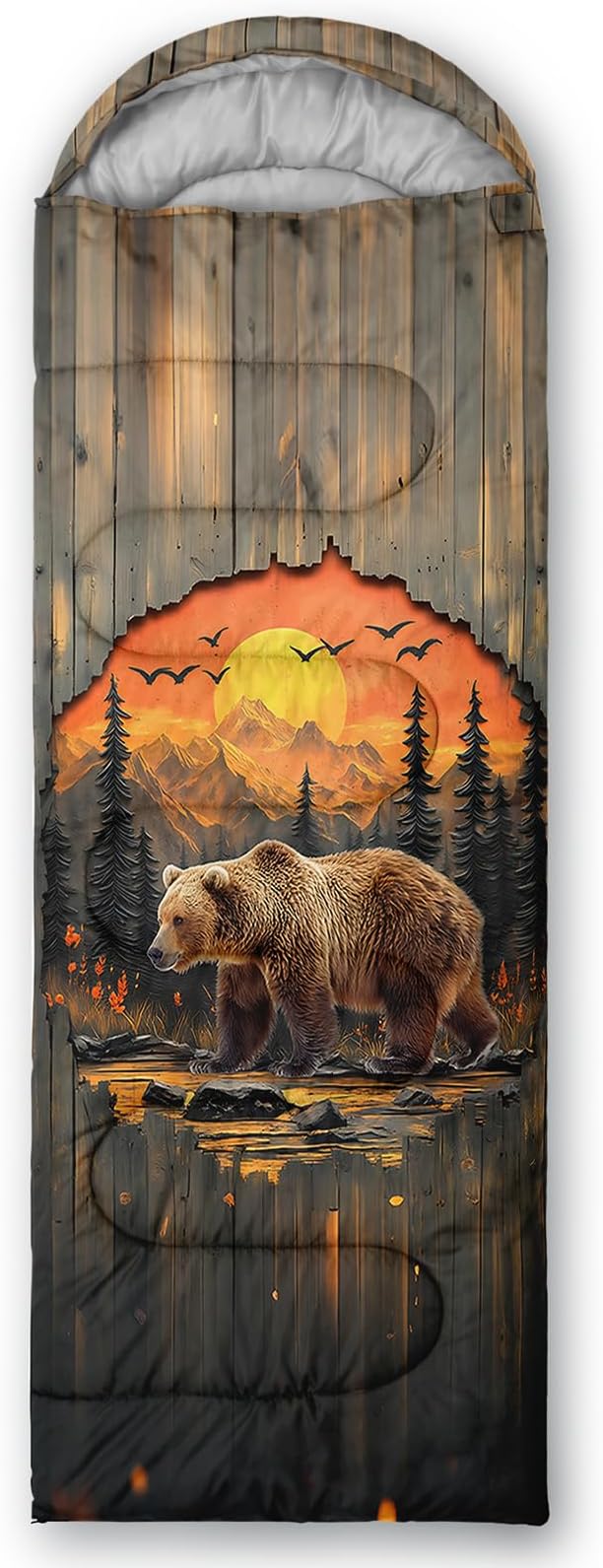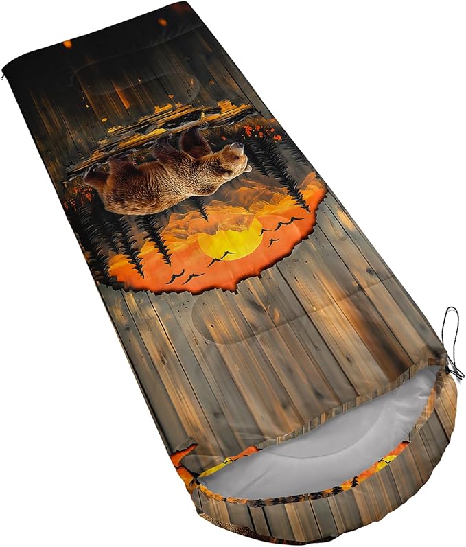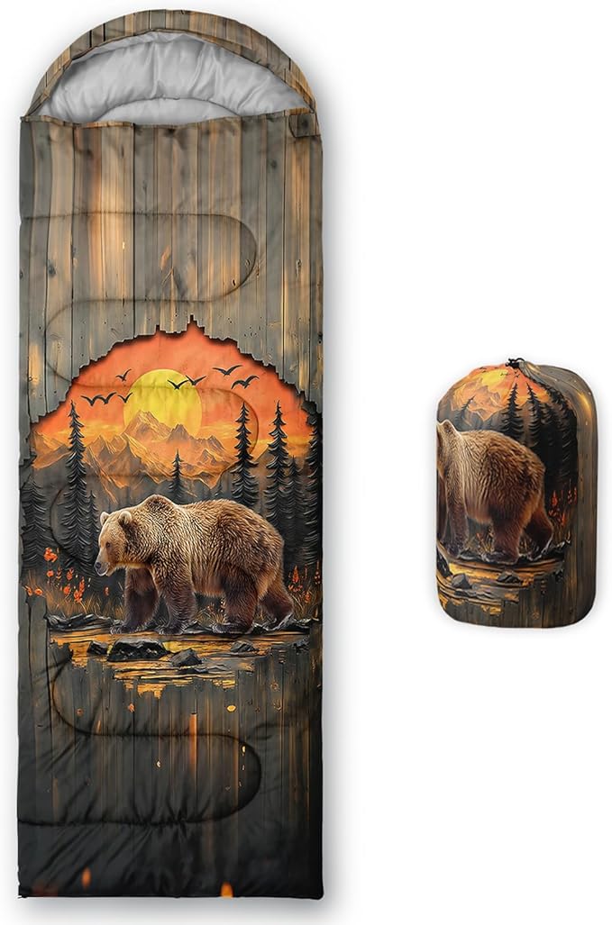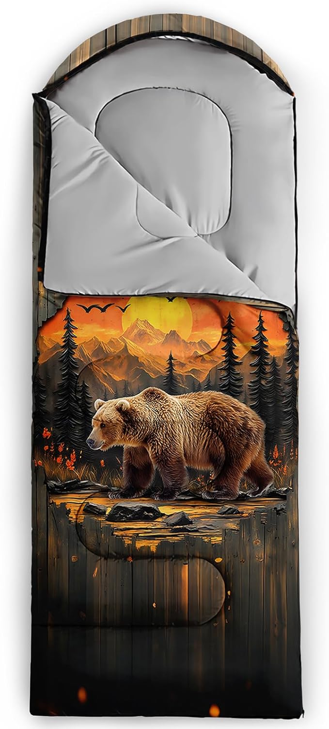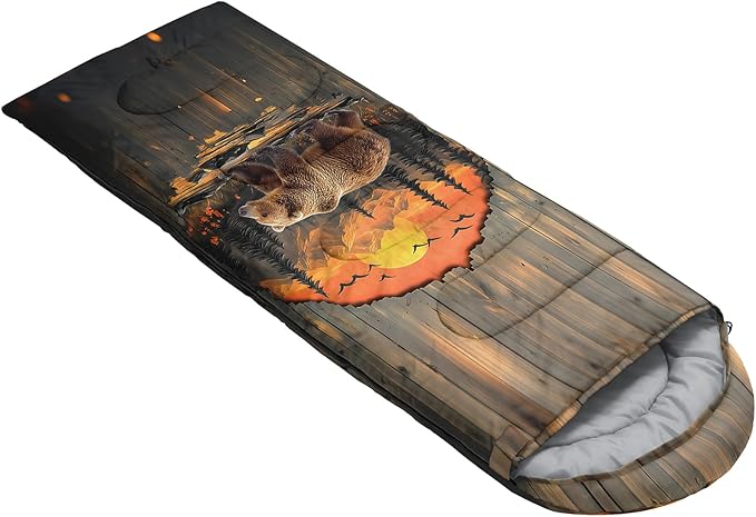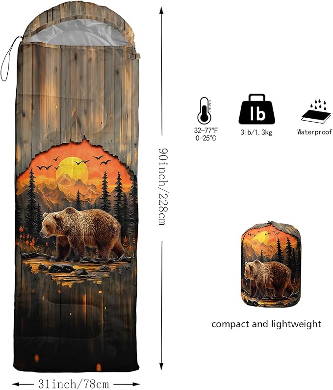 - Unique Bear Design:This Bear pattern sleeping bag is made of 3D digital printing with vibrant colors and patterns,size: 31W x 90L inches,temperature range: 32℉-77℉ (0℃-25℃),it also also have a weather resistant waterproof design to keep you warm and prevent you from any dampness,can be used in 3 seasons