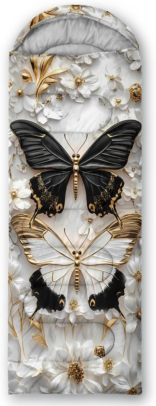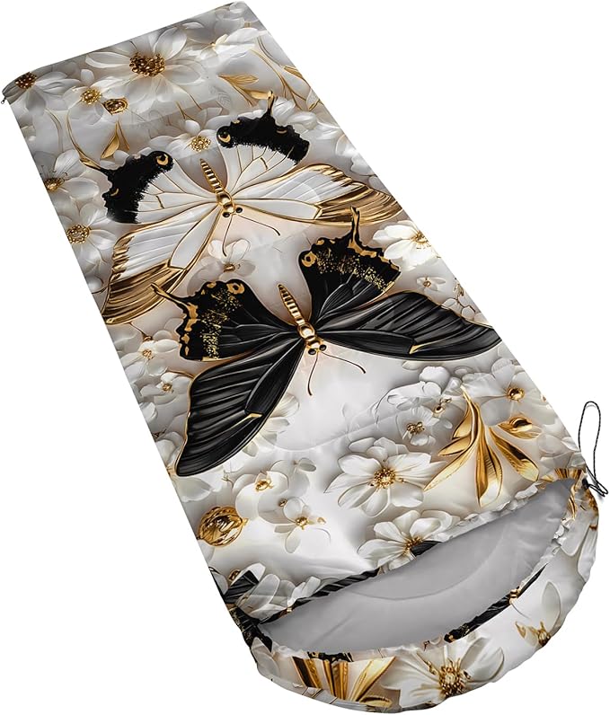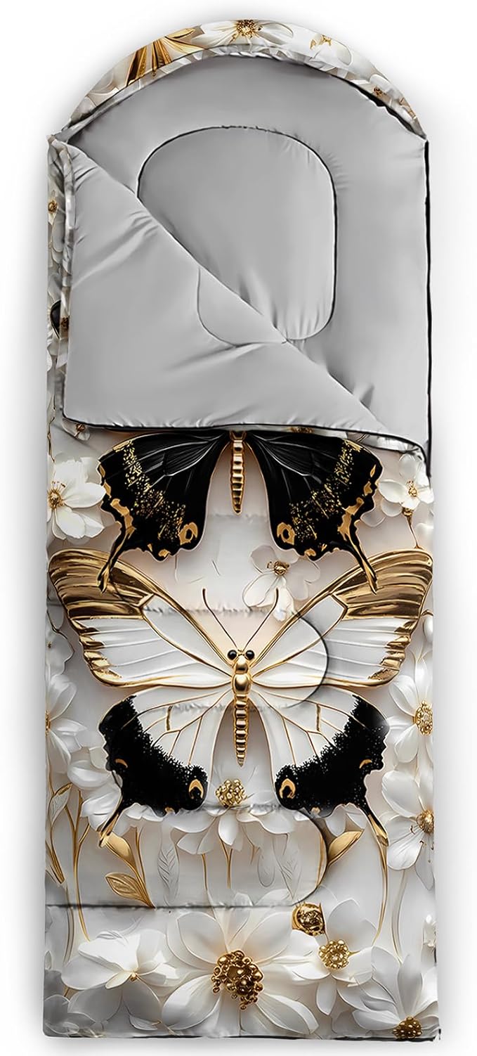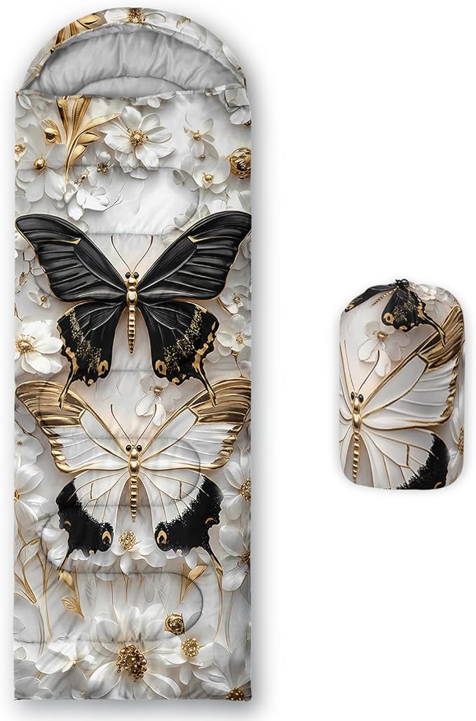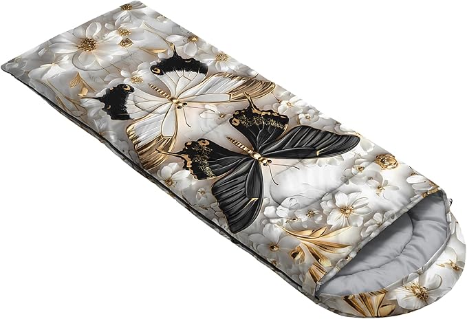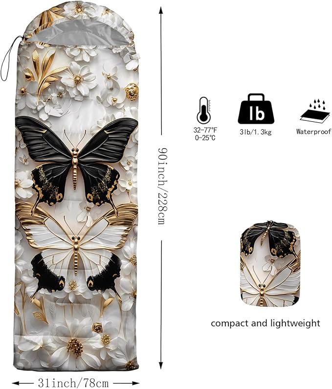 - Unique Butterfly Design:This Butterfly pattern sleeping bag is made of 3D digital printing with vibrant colors and patterns,size: 31W x 90L inches,temperature range: 32℉-77℉ (0℃-25℃),it also also have a weather resistant waterproof design to keep you warm and prevent you from any dampness,can be used in 3 seasons