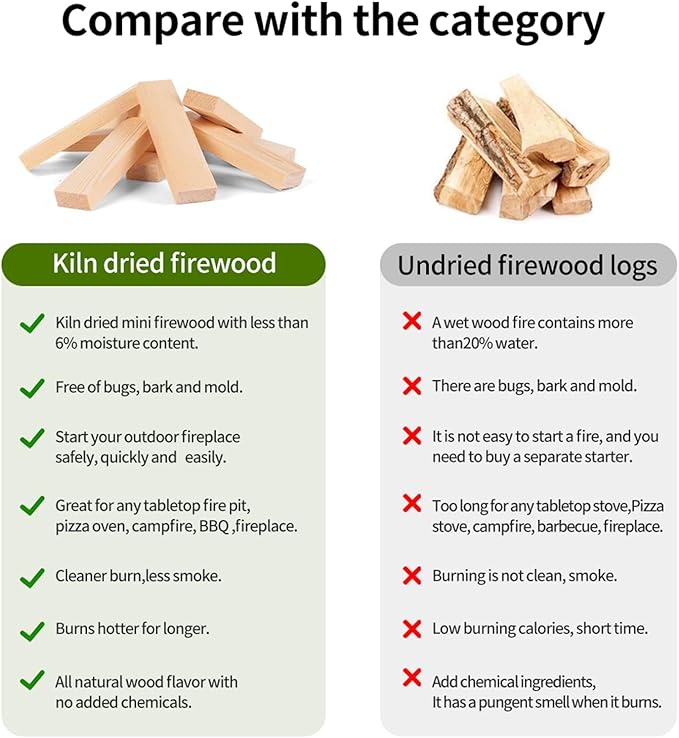 - ✔ 【EASY TO USE】--Each Kiln Dried Mini Firewood is professionally processed to ensure that you get exactly what you need without the need for additional processing or sourcing inferior wood.