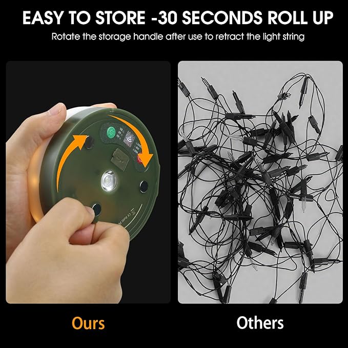 - Magnetic Base & Versatile Application — Three magnets on the base for you to stick this led camping latern to a metal surface, like a bike, car or a tent pole. Our camping string lights outdoor are not only suitable for camping, hiking, hunting, fishing and other outdoor activities, but also can be used for home decoration, hanging in the bedroom, backyard, camping tent, garden, RV, canopy, etc.