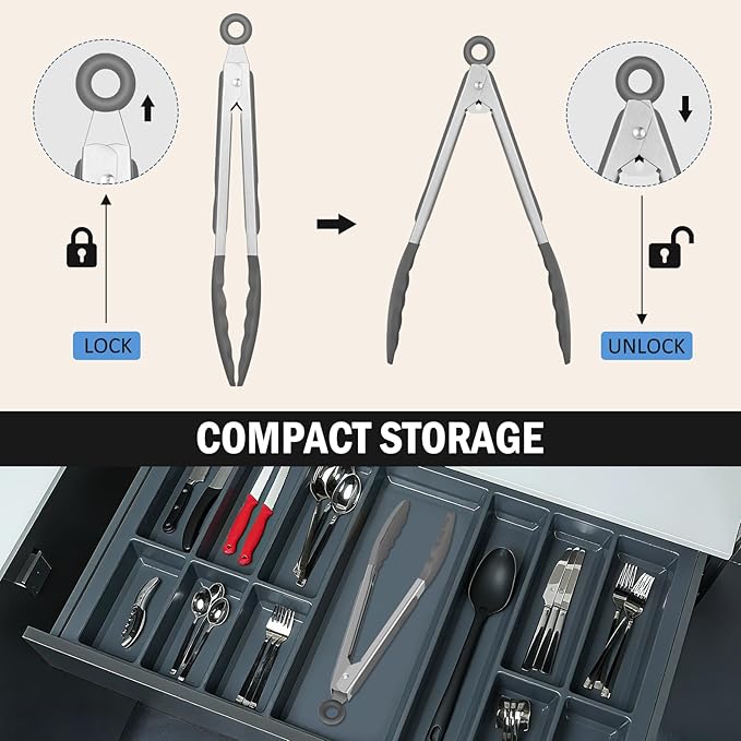- Locking Mechanism: This Cooking tongs have a ring pull locking mechanism, pull the ring for lock to save space, and push for open can be one-hand opration. Also include a hanging ring for easy hang and storage.