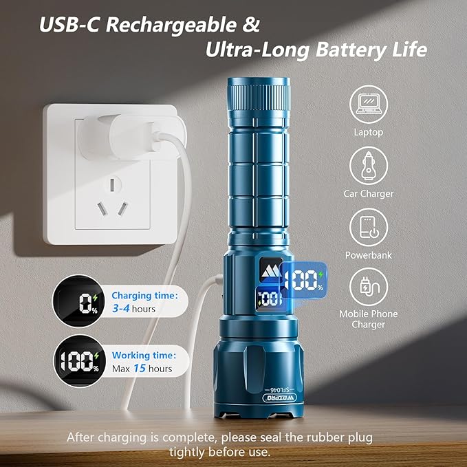- High Lumens LED Flashlights: WdtPro new SFL046 rechargeable led flashlight made of aerospace grade 6061 aluminum alloy, delivers an intense 6000 lumens of brightness and offers a wider beam range. Flashlights features an LCD battery indicator that shows remaining power in real time, so you always know exactly how much runtime you have left. When it comes to performance and value, the SFL046 outperforms every other tactical flashlight in its class, making it the perfect everyday lighting tool