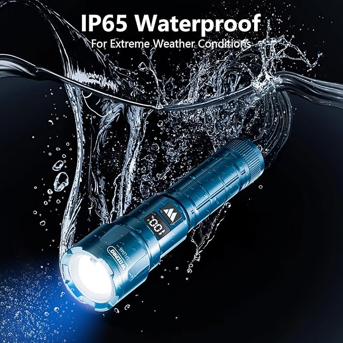 - Sturdy & IP65 Waterproof: Crafted from high quality, aerospace grade aluminum with a hardened anodized finish, this tactical flashlight offers superior shock resistance and scratch protection. Led flashlight for IP65 waterproof rating and integrated rubber sealing rings, it stands up to rain and snow without a problem. Whether you're night hiking or exploring the outdoors, this camping flashlight is built to be a trusted companion