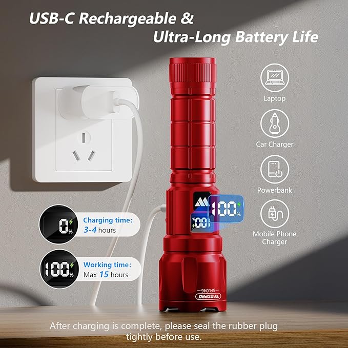 - High Lumens LED Flashlights: WdtPro new SFL046 rechargeable led flashlight made of aerospace grade 6061 aluminum alloy, delivers an intense 6000 lumens of brightness and offers a wider beam range. Flashlights features an LCD battery indicator that shows remaining power in real time, so you always know exactly how much runtime you have left. When it comes to performance and value, the SFL046 outperforms every other tactical flashlight in its class, making it the perfect everyday lighting tool