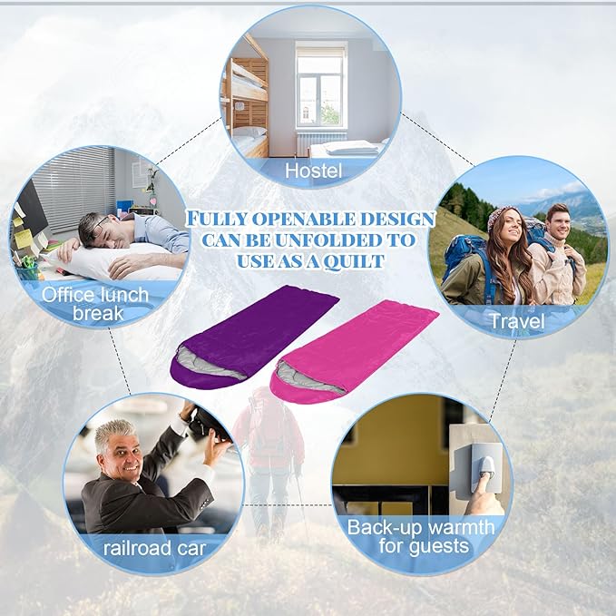 - Multiple Purpose: these compact sleeping bags are suitable for sleeping while camping, hiking, traveling, exploring, mountaineering, or you can unzip all zippers and use them as a comforter or blanket; You can also donate to the homeless and bring warmth to them