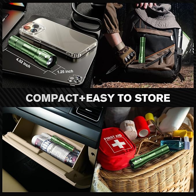 - Portable Small Flashlights: Our tactical flashlight is remarkably portable, measuring just 4.52*1.25 inches, and a lightweight of just 0.17 lb, which fits perfectly in your coat pocket, car, and hand; Compact and easy to carry; Ideal for various indoor and outdoor activities, this compact flashlight is perfect for camping, hunting, dog walking, cycling, or dealing with a power outage