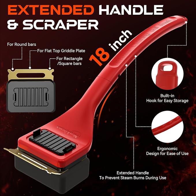 - LONGER HANDLE: We collected suggestions from many grill masters and found that the most common problem they mentioned was that the handle of the steam cleaning brush was too short, and it was easily burned by steam during use, so we extended and reinforced the handle to solve this problem, making it safer for you to use!