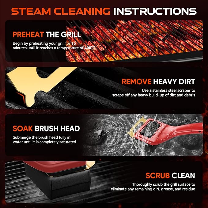 - EASY TO USE: Simply heat the grill to 400°F, use the stainless steel scraper on the brush head to scrape stubborn grease from the grill, soak the brush head in water, and then clean the grill with the power of steam to melt grease and stains instantly!