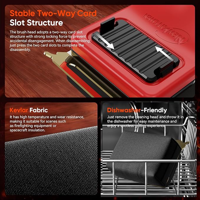 - KEVLAR FIBER: The grill cleaner brush head fabric is made of high-quality Kevlar for excellent abrasion resistance and superb heat resistance. It can consistently withstand a residual temperature of 600°F, ensuring efficient and thorough cleaning every time!