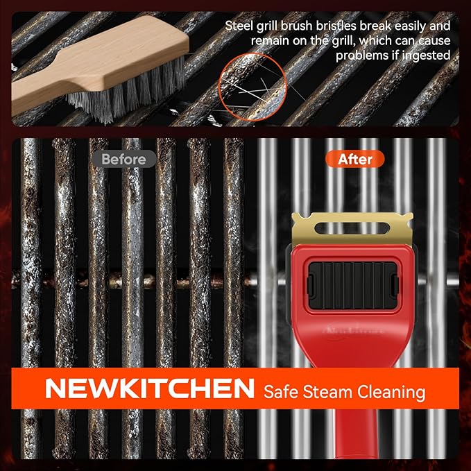 - SAFE AND EFFICIENT: Unlike traditional wire brushes, our grill brush uses the power of steam to quickly and easily melt grease, dirt, and food residue without having to worry about dangerous bristles falling into the food, so your family and friends can fully enjoy their grilling time!