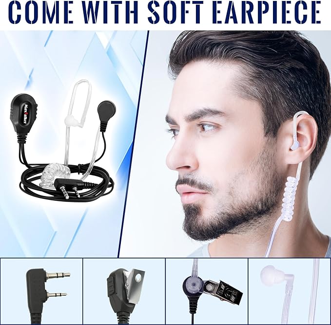 - Upgraded Earpiece: MaxTalker walkie talkies come with upgraded earpiece which design with Air Acoustic Tube and silicone in-ear earbuds, which compared with the common walkie talkies with earpiece and mic set, you won't feel uncomfortable even if you have weared it for a long time.