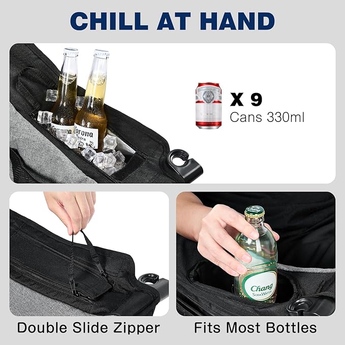 - 【Your Portable Cooler Companion】Never warm up your drink again! This oversized chair is equipped with an extra-large, adjustable dual cup holder that securely grips everything from tall tumblers to soda cans. Plus, the built-in insulated cooler bag holds up to 9 of your favorite beverages (330ml each), keeping them frosty for hours. It’s the ultimate all-in-one relaxation station for thirst-quenching convenience at the beach, campsite, or tailgate party.