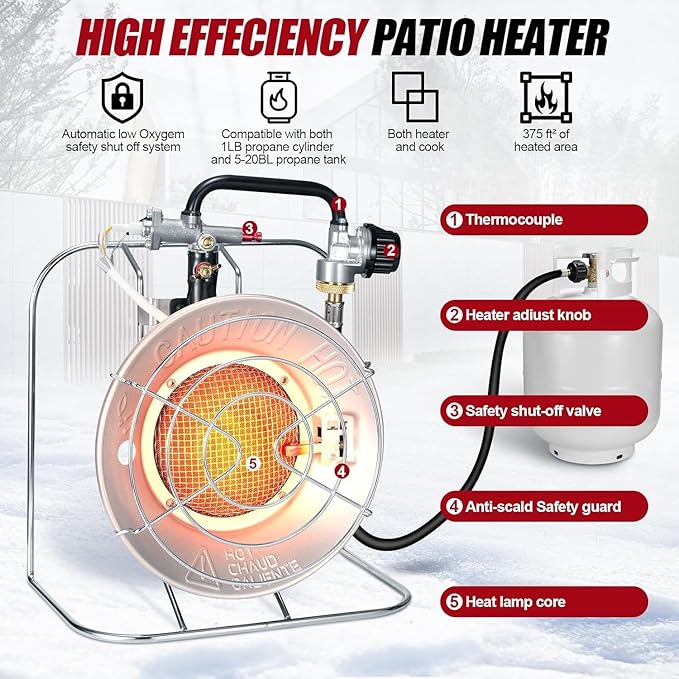 - 【Safety Propane Patio Heater】The Automatic Safety Shut-Off Valve and Exterior Face Guard of the portable propane heater ensure your safety during use. Constructed entirely of metal, it eliminates the risk of fire and burning.