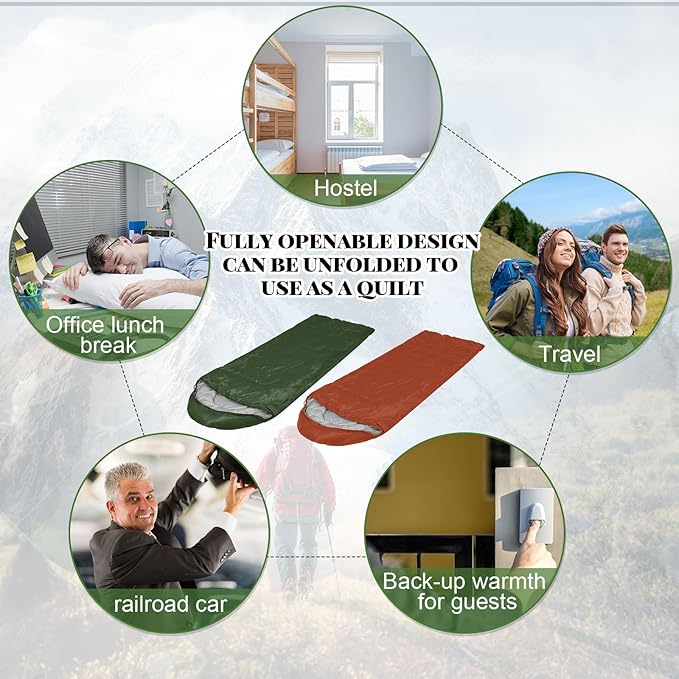 - Suitable for 4 Seasons: this lightweight sleeping bag is suitable for using all year round and has a weatherproof design that resists moisture and keeps you warm even in extreme weather; With this sleeping bag, you can get deep sleep after camping or hiking