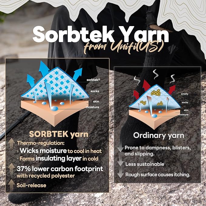 - 【Dry Comfort】Renowned for moisture control, hollow‑core alpaca fibers wick and regulate temperature, absorbing up to 30% moisture and drying faster than many fabrics. Sorbtek yarn by Unifi (USA) speeds transport to keep feet drier and fresher. Breathability helps reduce odor and foot fatigue, sustaining comfort through temperature swings. Whether hiking, hunting, skiing, or relaxing, these thermal winter socks keep you comfortable all day.