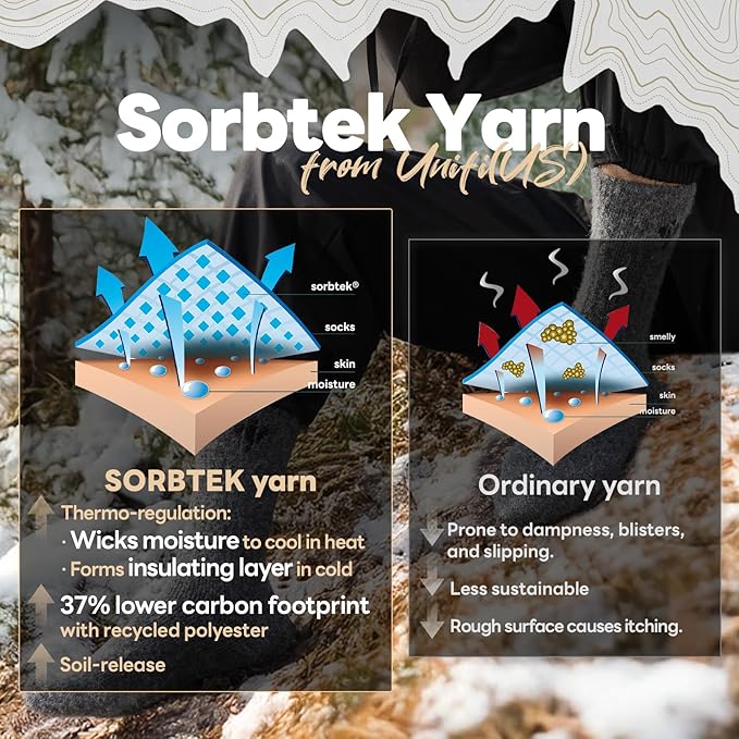 - 【Dry Comfort】Renowned for moisture control, hollow‑core alpaca fibers wick and regulate temperature, absorbing up to 30% moisture and drying faster than many fabrics. Sorbtek yarn by Unifi (USA) speeds transport to keep feet drier and fresher. Breathability helps reduce odor and foot fatigue, sustaining comfort through temperature swings. Whether hiking, hunting, skiing, or relaxing, these thermal winter socks keep you comfortable all day.