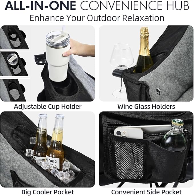 - Extra Storage Space - The camping chair provides wide cup holders and dedicated wine glass holders; side pockets store phones,or carry bag. Our heated lawn chair delivers organized storage for tailgating and hunting gear.