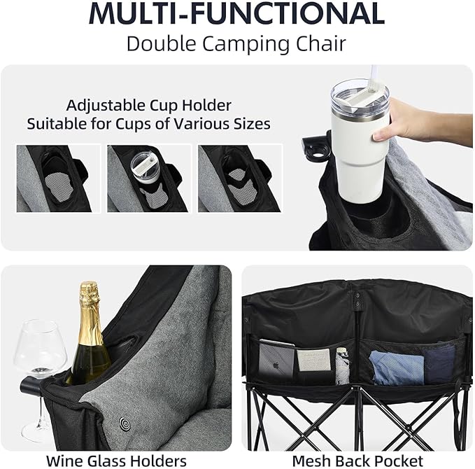 - Extra Storage Space - The two person camping chair provides wide cup holders and dedicated wine glass holders; Back storage pockets store phones, laptops, or compact blankets. Our heated lawn chair delivers organized storage for tailgating and hunting gear.