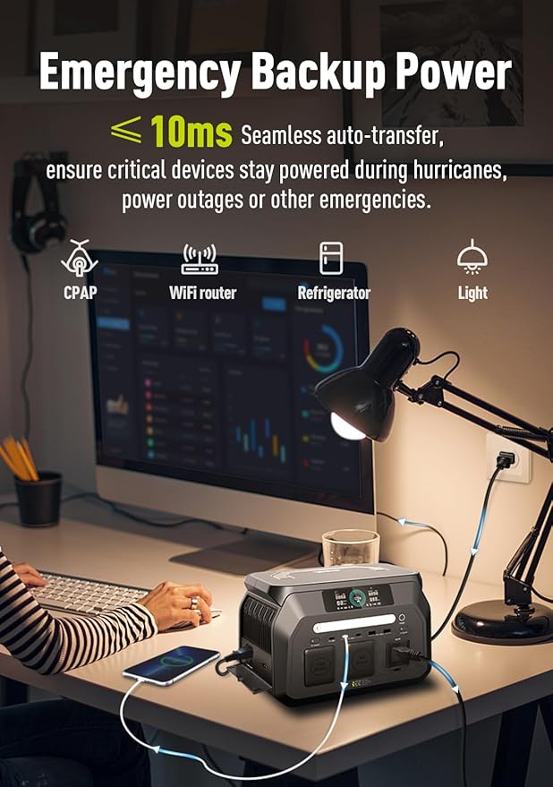 - 【Emergency Backup Power And <10 MS UPS】The IEE P800 boasting a 800W AC output and a 1,600W surge peak,ensures <10 ms switchover for premium UPS protection,can be used during power outages,hurricanes or other emergencies,to run essential appliances like refrigerators,lights,provides power for CPAP machines, heaters, and other critical devices.