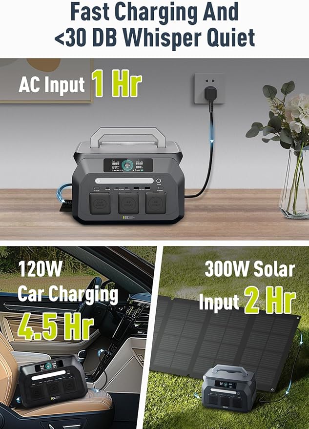 - 【1 Hour AC Recharge And Multiple Charging Options】Fast charging capabilities ensure the IEE P800 can be quickly replenished.Reach from 0% to 80% in under an hour and achieve full charge in 1.2 hours using AC wall outlet.Also supports both solar panels and car charging.You can recharge IEE P800 in 2.3 hours with 220W of solar input.IEE P800 also operates at a ultra quiet mode,controlling the volume to less than 25 dB at a distance of 1.5 ft,won’t disturb your peace.