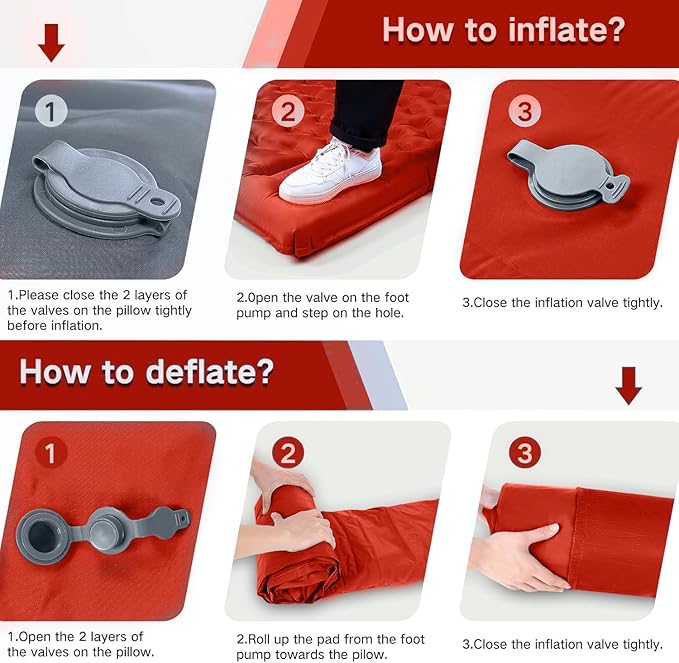 - BUILT-IN FOOT PUMP: No mouth blowing, no extra pump, FNARMW wide sleeping pad features a built-in foot pump. It takes only 3mins to fully inflate this thick queen sleeping pad by foot pressing, no mouth, no hands, clean and hygienic, even kids can finish inflating. Two double layer valves on the pillow can effectively prevent air leakage and achieve rapid deflation, just remember to close the valves tightly before inflation. NOTE: the inflation time depends on the speed of your foot pressing.