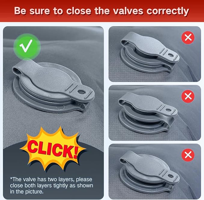 - Note:We have 2 double-layered valves on the one-piece pillow of the sleeping pad. Please close the valves tightly, and check the valves first if you find any leaking.