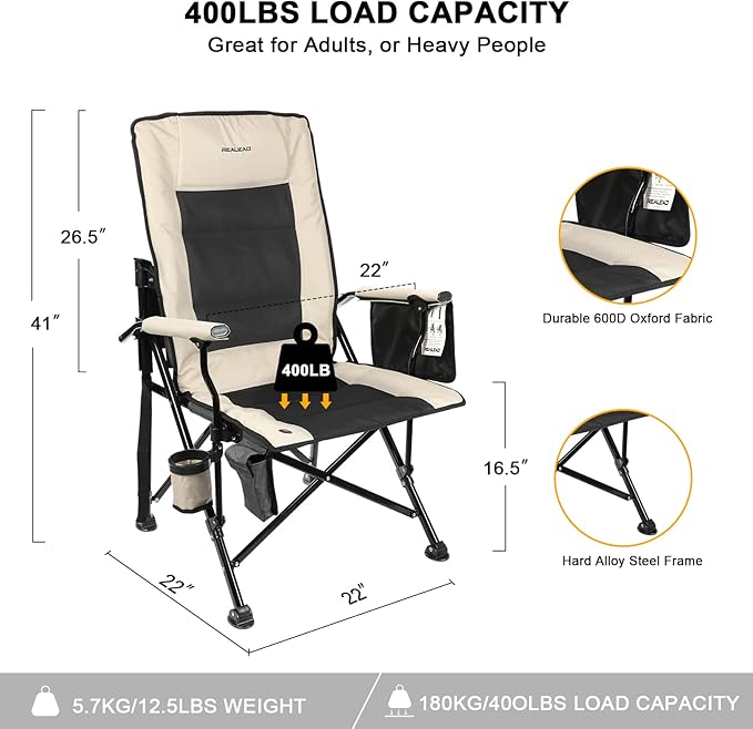 - 【Stable Structural Frame with 400lbs Load Capacity】Foldable Hard Alloy steel frame with coating prevent corrosion and fading. Durable oxford fabric make the chair extra sturdy. Stable steel frame construction make it can support up to 400 lbs. Whether you are tall or heavy people, this heated camp chair can let you enjoy the ultimate comfort. You will get a long lasting chair to enjoy outdoors all year