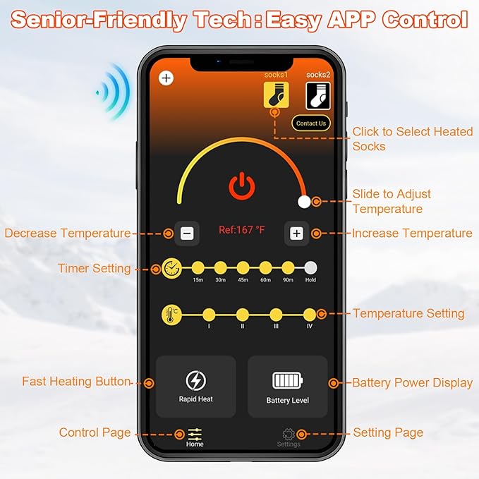 - 【Smart App & Battery Button Dual Control】Take full command with our updated and intuitive app!Adjust your heated socks to any precise temperature between 113°F–167°F with a simple swipe. Set 5 different timers (15-90 mins), activate quick-heat, and monitor real-time battery levels.Or,use the physical buttons on the battery pack to adjust heat easily when your phone isn't handy. Perfect for hiking or hunting.Even for elderly parents, they can operate it easily