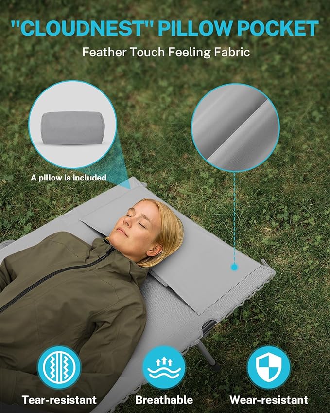- 【Easy to Assemble】The cot uses the 5th-generation upgraded lever-locking system, which makes setting up a camping cot more convenient. It can be installed easily in four steps and the installation can be completed in only 60 seconds