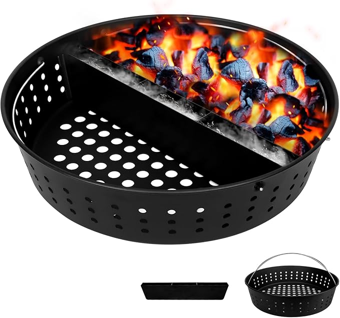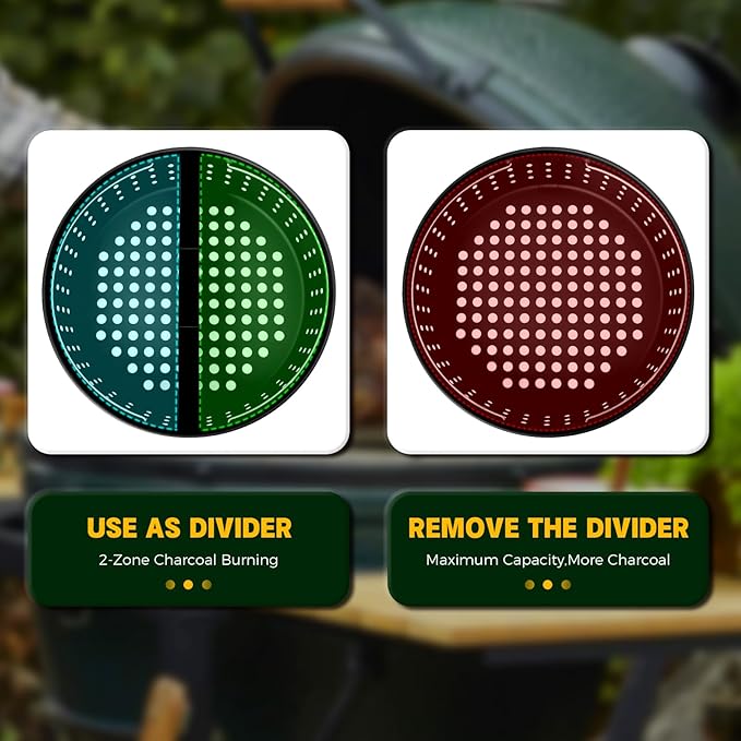 - 【FIRE BOWL FOR XL WITH REMOVEABLE DIVIDER】The XL charcoal basket include a divider for 2-zone charcoal burning.Use this divider,chef can use half of the area and concentrate the firepower to cooking.Remove this divider,you will gain the largest area of charcoal burning area, with the most intense firepower for long-term grilling/low&slow cooking.