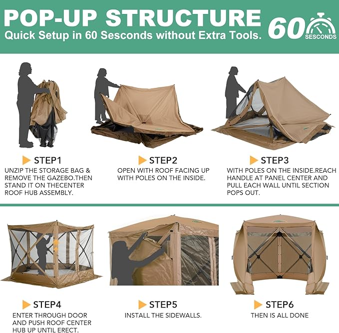 - ✅【Comprehensive Packing List & Warranty】 Your purchase includes 1 Tent Gazebo with Frame, 1 Upgraded Carrying Bag, 2 Door Frame Poles, 10 Stakes, 5 Ropes, and a User Guide. If any accessories are missing or damaged, please contact our customer service for prompt replacement. Note please: Upon first opening, the screen tent may appear inside out. This is intentional for compact storage. Do not attempt to reverse it, as it may cause damage to the gazebo.