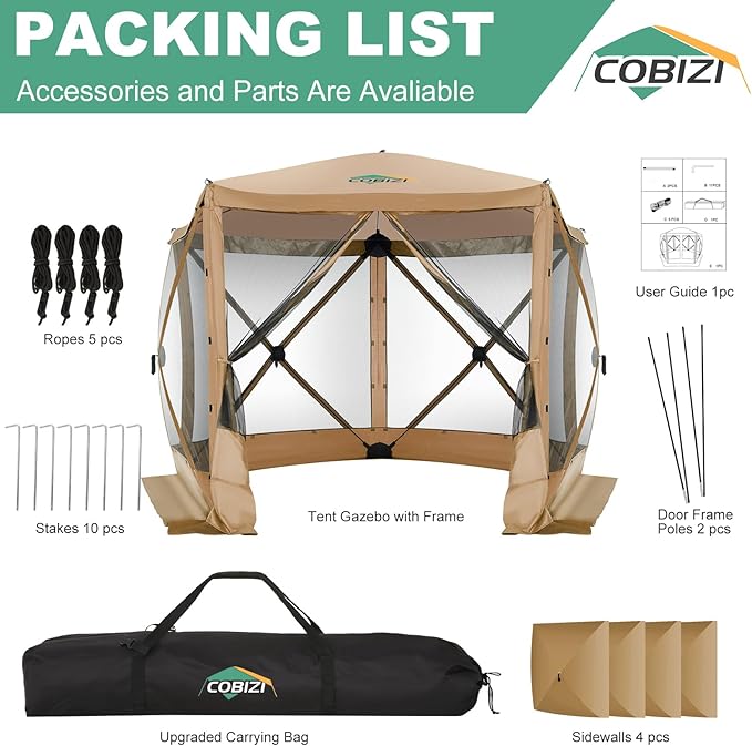 COBIZI 10x10 Pop up Gazebo Screen House Tent for Camping, Pop-up Camping Canopy with Sidewalls, Portable Outdoor Quick-Set Hub Tent with Carrying Bag&Ground Stakes, Khaki(Upgraded 2.0)