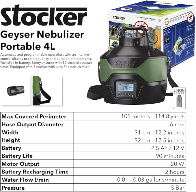 Stocker Portable Insect Mister 4L + US Plug Adapter - Rechargeable, for Mosquitos, Flies, Gnats, Pest Misting - Great for Outdoor, Camping, Hiking, Backpacking, Backyard BBQ