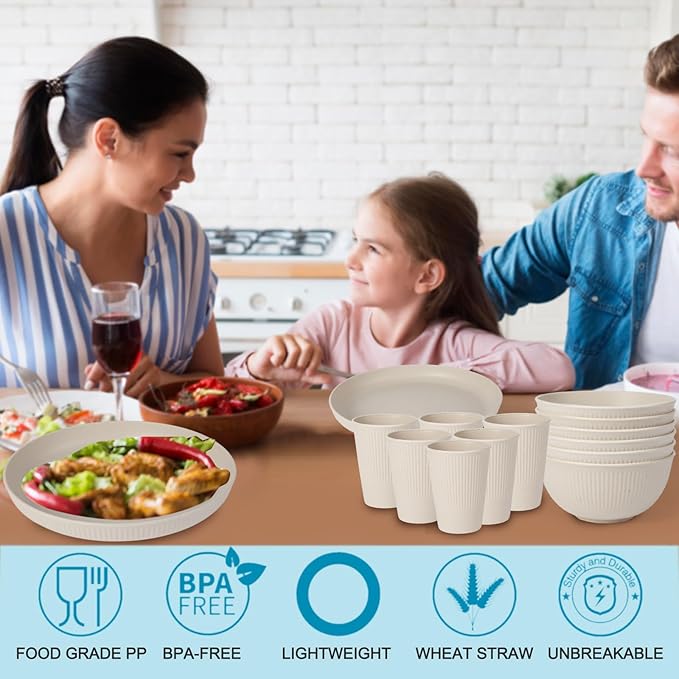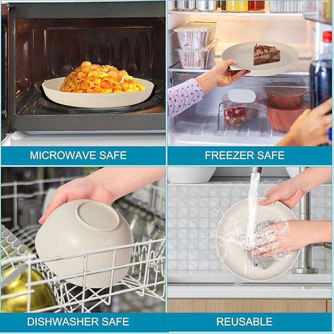 - Eco-Friendly & Food Safe: Made from natural wheat straw fiber and food-grade PP material, this dinnerware set is 100% BPA-free, lightweight, non-toxic, and odorless. It's reusable and environmentally friendly, making it a healthy choice for direct food contact.