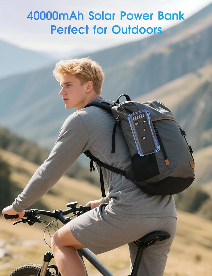 - 【Built-in 4 Charging Cable】Our upgraded solar charger features 3 output cables (Type-C *1, iOS *1, and Micro USB *1) and 1 USB-A input cable. Equipped with 3 ports (USB-C output/input, USB-A output, Micro input) Simultaneously charges up to 5 devices. Whether for output or input, you no longer need to carry extra charging cables. Say goodbye to messy cables and charge anytime, anywhere.