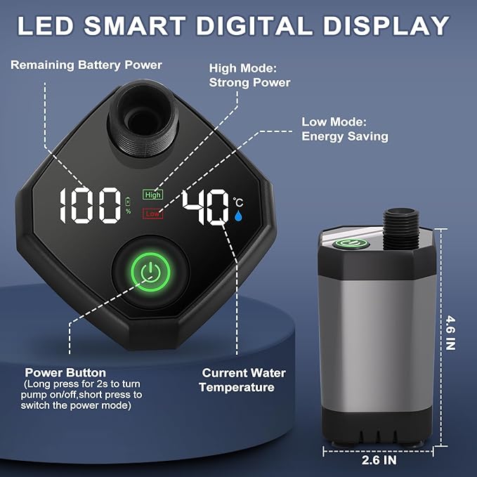 - ๐ Instant Hot Shower System with Smart Display--6000mAh battery-powered pump features real-time temperature display + battery indicator. Adjust spray intensity (mist/medium/strong) via showerhead. 1500W immersion heater heats water in minutes with auto shut-off at 167ยฐF (75โ) for safety.