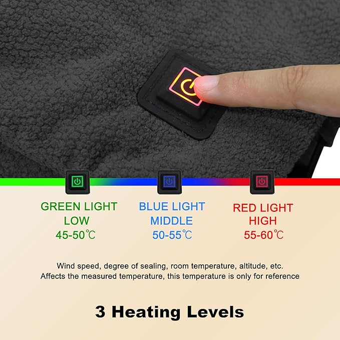 - 3 Kinds Heating Level Mode: 3 kinds of heating level modes for you to select the suitable heat output as you need by simply pressing the power button, USB power supply. The first one is "High/Red", the second one is " Medium/Green", the last one is “Low /Blue".